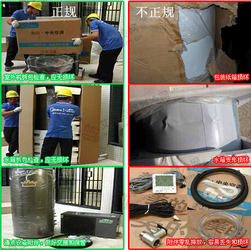 非專業(yè)安裝,讓你可能面臨:樓房裝修破壞,無限的高強度噪音,一系列安全隱患……只有通過專業(yè)的空調(diào)安裝,你的安全才能得到保障,才能真正享受中央空調(diào)帶來的舒適感受。 1、拆包檢查